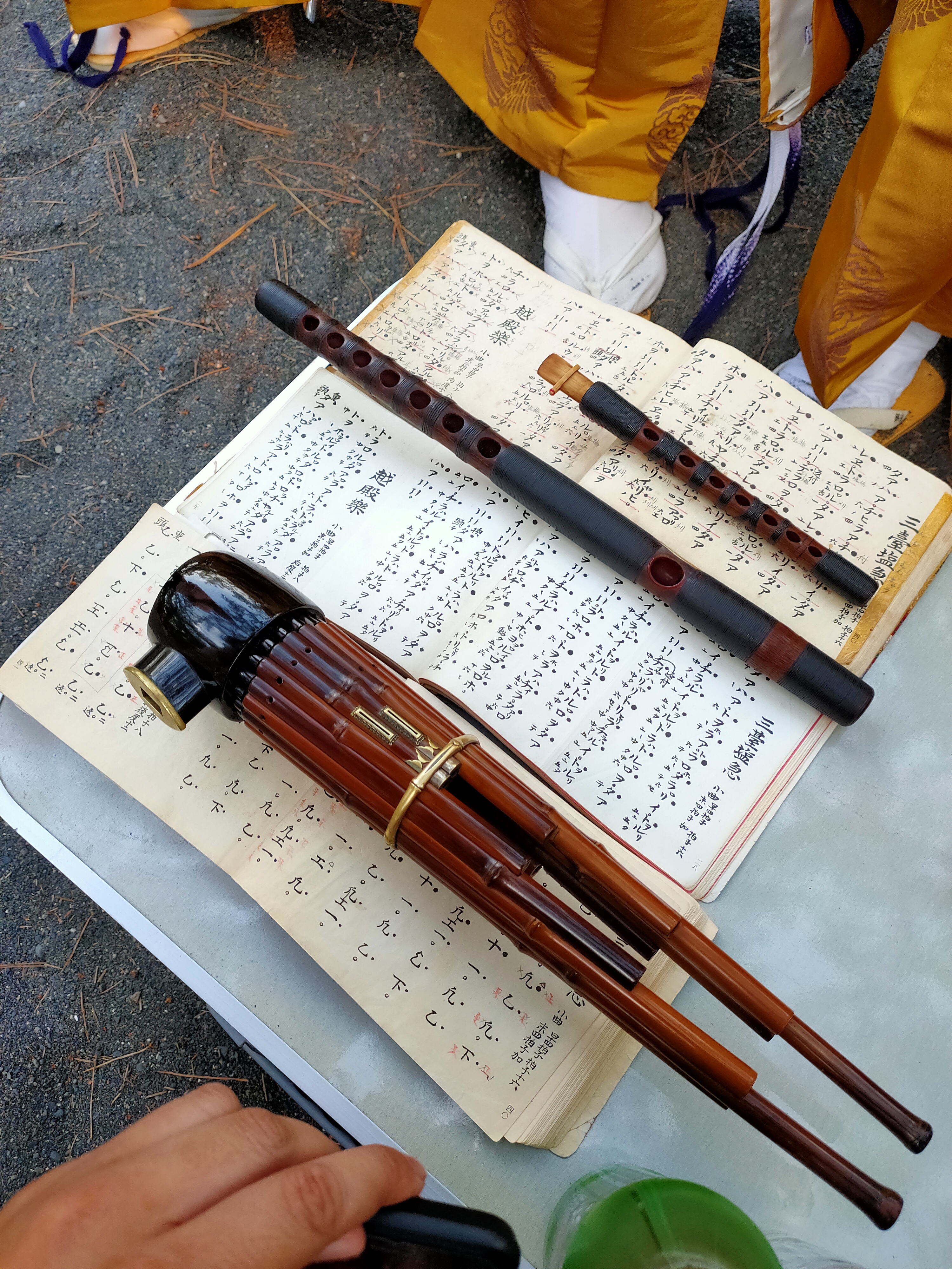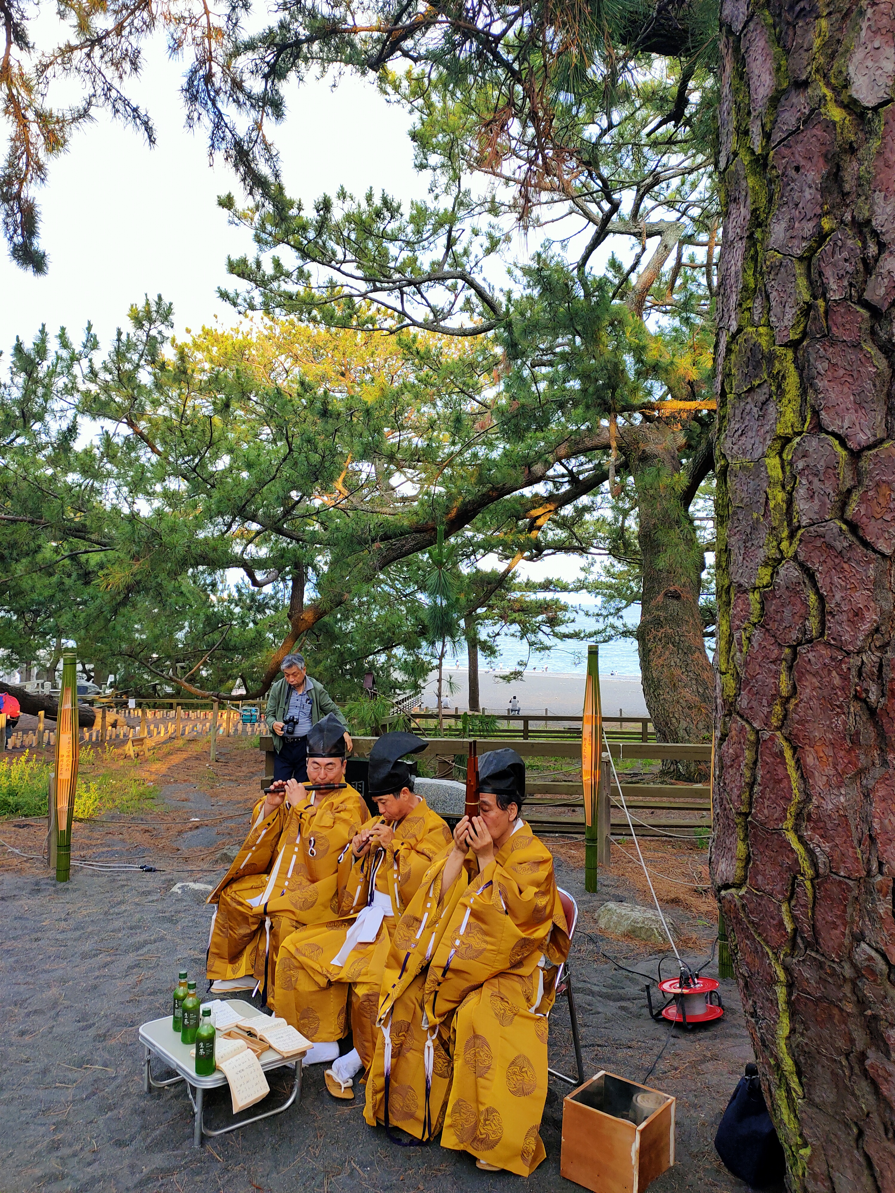 Il y avait également une représentation musicale de Gagaku à cette occasion, juste derrière le Pin de Hagoromo. Ici de bas en haut, vous avez le shô 笙, le ryûteki 竜笛 et le hichiriki 篳篥. Les musiciens nous ont joué un morceau puis on prit le temps de nous expliquer les particularités du Gagaku et de chaque instrument. Tous les instruments sont fait en bois de bambou, mais pas n’importe lequel ! Lorqu’ils fabriquent les instruments, les artisans recyclent le bambous utilisés dans les structures d’anciennes maisons. Ce bambou là, après avoir été en contact avec la fumée du feu de maison ne pourrira pas. C’était vraiment intéressant !