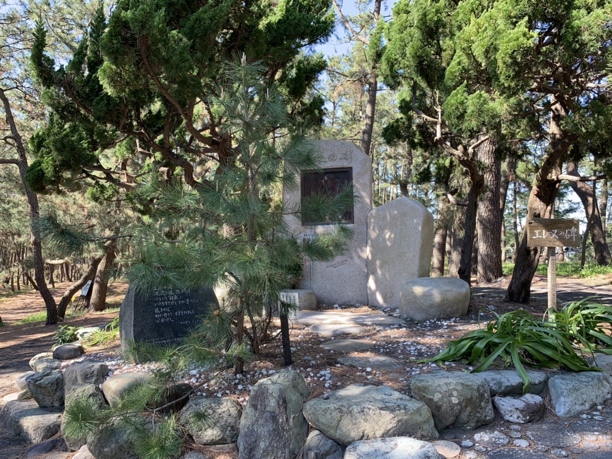 Il y eut une dame qui fut profondément émue par cette pièce de Noh – Hagoromo. Il s’agit de la danceuse française Hélène Giuglaris. Elle apprit la danse par elle-même et l’interprêta sur scène. Hélène rêvait de visiter Miho no Matsubara qui inspira cette pièce mais le destin en décida autrement. Plus tard, son mari se rendra au Japon à Miho et racontera son histoire au population locale. Très émus, ils lui firent un monument en son hommage au sein de la pinède.