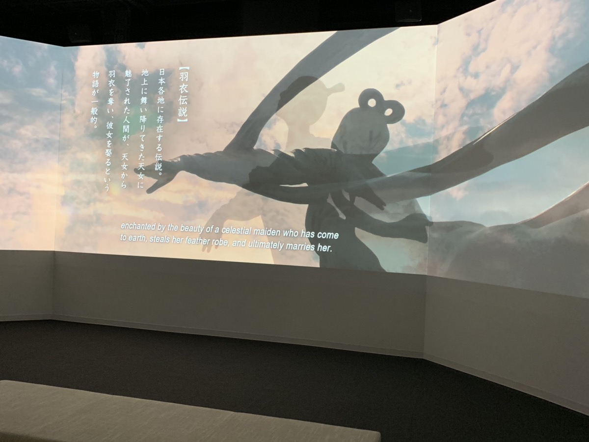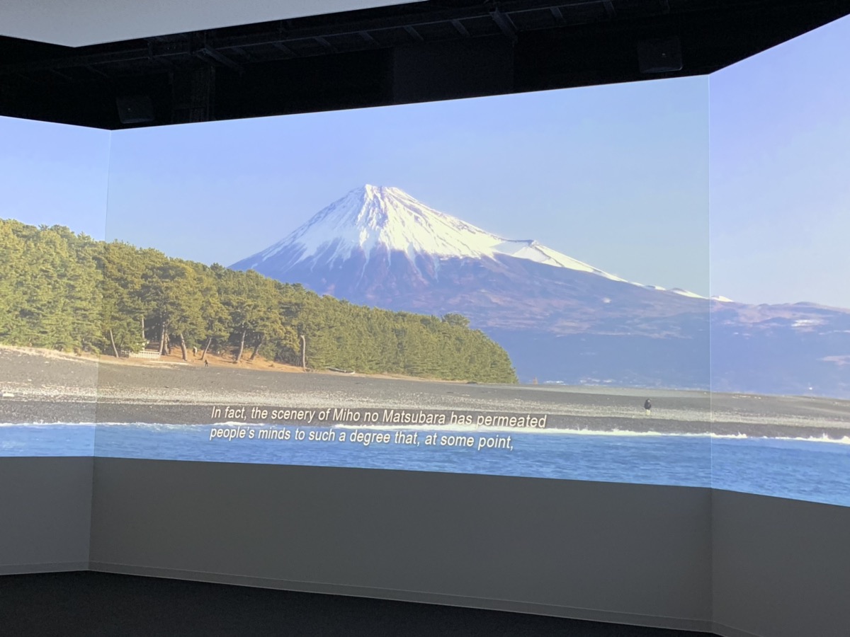 Au rez-de-chaussée, il y a une première salle d’exposition sur la place qu’occupe Miho no Matsubara dans la culture locale. Vous pouvez télécharger un guide audio sur votre smartphone dans les 4 langues suivantes : Japonais, Anglais, Coréen et Chinois. Et ainsi en savoir plus sur les différentes peintures et poèmes inspirés de ce lieu pittoresque et découvrir la légende de Hagoromo (je reviendrais dessus un peu plus bas 🙂). Vous pourrez aussi passer par le théâtre vidéo et apprécier 2 vidéos, sur le paysage qu’offre la pinède au fil des saisons d’une part, et sur l’histoire de Hagoromo d’autre part.