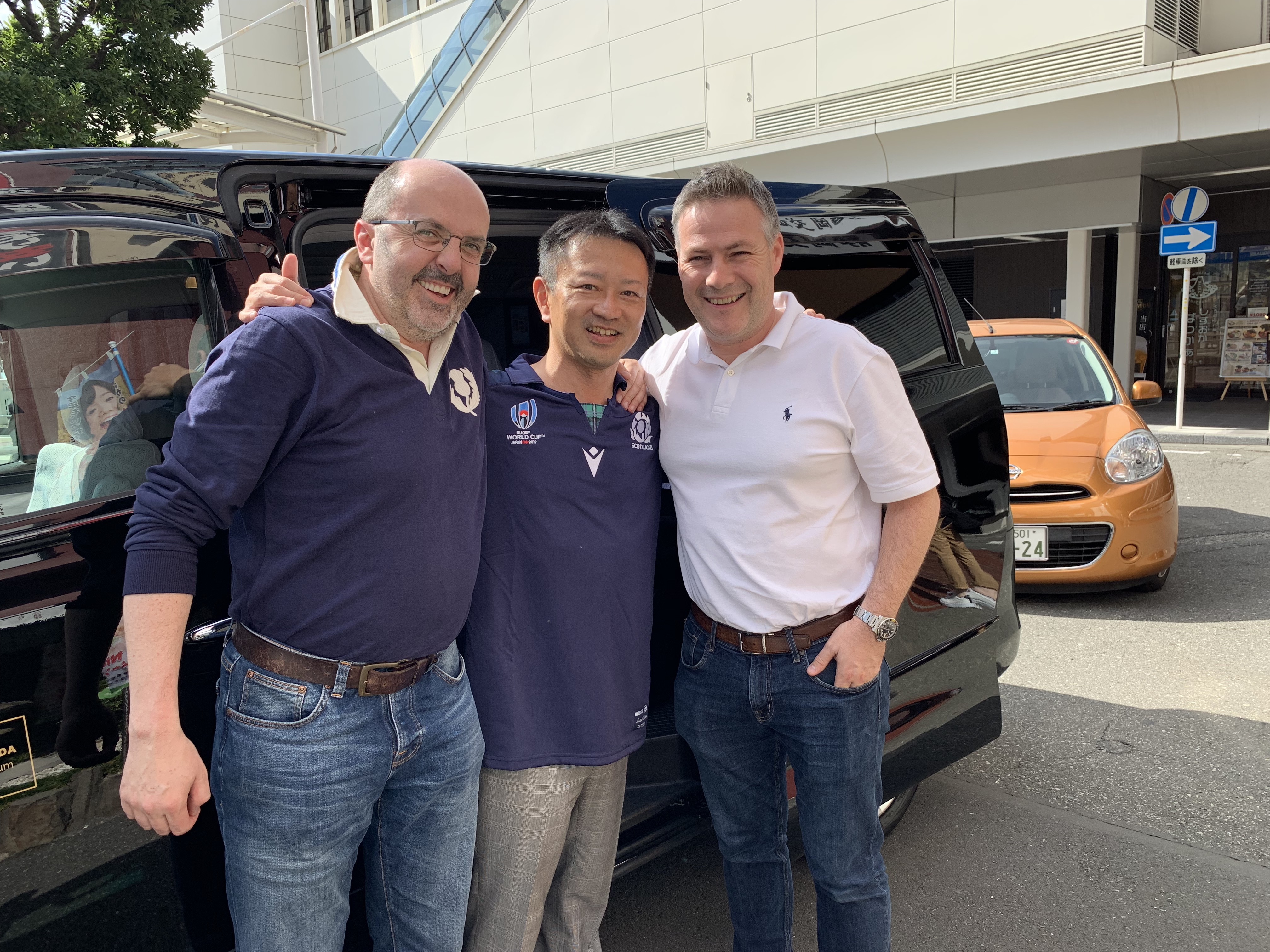 こちらもスコットランドからのお客様。朝、東京から静岡駅に到着、お2人ですが、ジャンボタクシーでエコパスタジアムへ観戦に。スケジュールがタイトなようで、タクシーはそのままチャーターです。(タクシーは試合中待機)試合終了後、東京のホテルまでタクシー移動。日本人の感覚とはちょっと違いますね。そして、私が大好きなスコッチウィスキー、「ラフロイグ」のお土産まで…。ありがとうございました。私もスコットランドのジャージでお迎えしました。